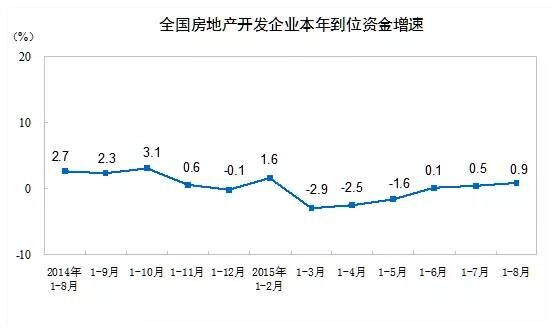 二是房地產開發企業到位資金增長小幅加快。1-8月份,全國房地產開發企業到位資金同比增長0.9%,增速比1-7月份提高0.4個百分點。隨著商品房銷售持續向好,今年1-3月份以來,企業到位資金呈逐月回升走勢,1-6月增速由負轉正。