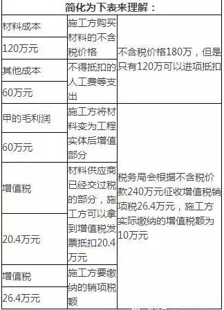 假定施工方除材料外每月其余費(fèi)用為10萬(wàn)元(無(wú)法取得增值稅專用發(fā)票,均無(wú)法做進(jìn)項(xiàng)稅抵扣),那么施工方每月的進(jìn)項(xiàng)稅額=20×17%=3.4萬(wàn)元,施工方每月的銷項(xiàng)稅額=40×11%=4.4萬(wàn)元,所以施工方每月應(yīng)繳納的增值稅額=4.4-3.4=1萬(wàn)元。