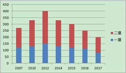 政府層面來講有兩類政策沖擊了傳統的建筑培訓市場,一類是國務院簡政放權背景下出臺的證書新政,另一類是住建系統響應進一步降低市場準入門檻出臺的資質新政。國家的證書新政簡單講就是弱化證書的證明效力,淡化證書的政府背書,將背書主體轉移給社會。很多人對證書新政的精神吃不透,明白我這三個判斷就行了。總體來講不是證書不行了,而是證書的內涵(效力)和外延(適用性)發生了質的變化。住建系統在企業及其從業者個人資質管理上這幾年是走了彎路的。2007年的“八大員”在國務院命令調整后,盡管表面上全系統改變了住建部統一號令天下的局面,但一直到2012年,無論是中字頭的行業協會還是省市的行業協會、住建廳局,都還在或明或暗地大力推進崗位證書,甚至像四川等省份還強化了崗位證書官方色彩。而企業資質在2014年到2015年也被人為地拔高,大有風雨欲來的陣勢。這些悖潮流而動的行為不僅沒有為建筑培訓行業帶來命運的轉折,反而誤導了行業內的主體,大家共同浪費了近10年的時光,耽誤的時機更是無法精確計量了。此為大憾,每念及此,我都感慨不已,人生沒有幾個像樣的十年,十年時光對一個處于高速發展的行業來講也是至關重要的,錯過的或許不是一星半點兒。但好的是,住建系統現在終于艱難地扭轉了政策方向,走在了正確的道路上。企業資質門檻的降低意味著持證人數基數下調,再加上清理掛靠措施并舉,2014年以來一二建考生人數整體上以每年20%的速度下降(中國建設教育發展年度報告,2016)(圖2)。