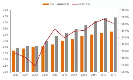 圖表2:東部地區與西部地區人均基礎設施相對量比較(2006-2016)