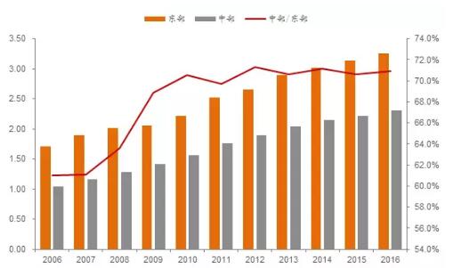 圖表3:東部地區與中部地區人均基礎設施相對量比較(2006-2016)