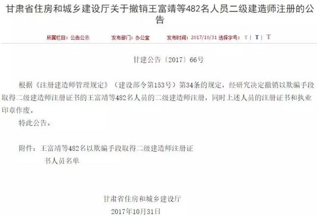 2016年以來,“四庫一平臺”真正發揮作用,多名注冊人員因“掛證”被通報或處分。2017年10月底,甘肅省住建廳一次性撤銷482名二級建造師的執業資格,這也是近年來力度最大的一次掛證查處。