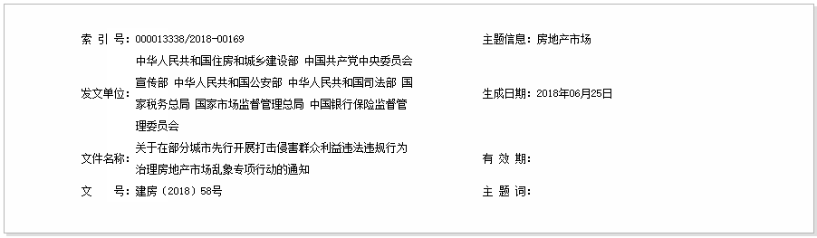 為全面貫徹落實黨中央、國務院關于房地產工作的決策部署,決定于2018年7月初至12月底,在部分城市(名單附后)先行開展打擊侵害群眾利益違法違規行為、治理房地產市場亂象專項行動。現將有關事項通知如下:
