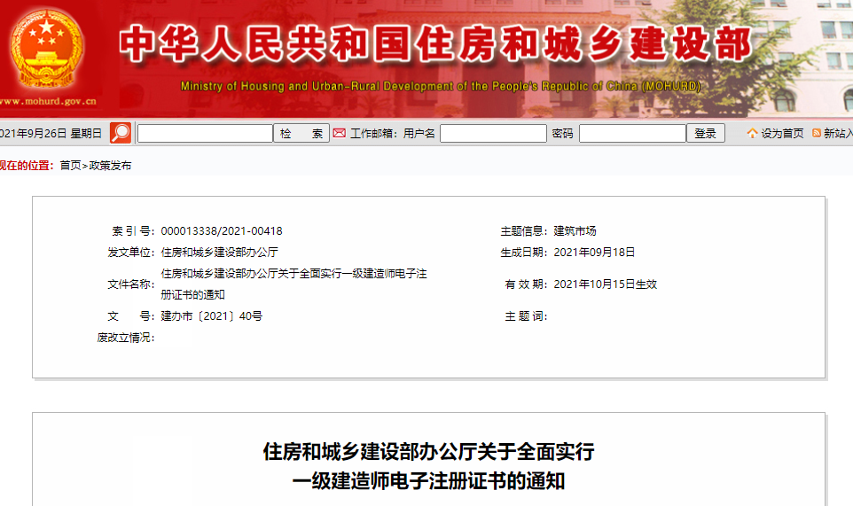 2.自2021年10月15日起,全國范圍內準予一級建造師初始注冊、增項注冊、重新注冊、延續注冊的,不再發放紙質注冊證書或加貼防偽貼;聘用單位基本信息修改的,不再加貼防偽貼;因紙質注冊證書遺失、污損或個人信息修改等需重新發放注冊證書的,不再補發或更換紙質注冊證書。