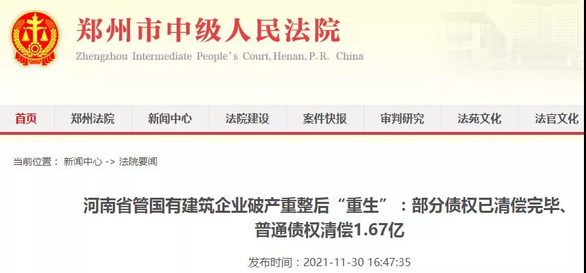 近日,鄭州市中級人民法院發布一則要聞。河南省管國有建筑企業破產重整后“重生”:部分債權已清償完畢、普通債權清償1.67億!