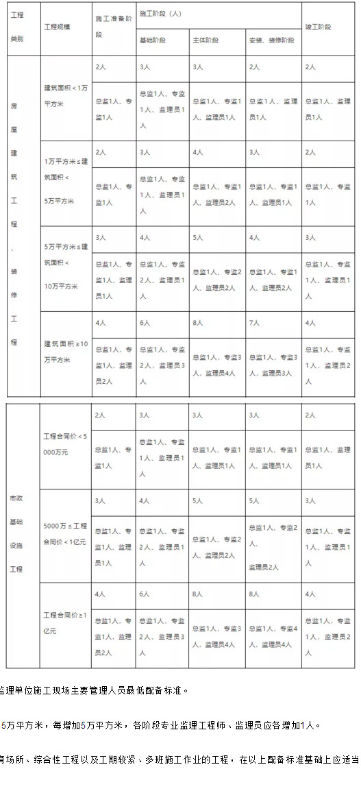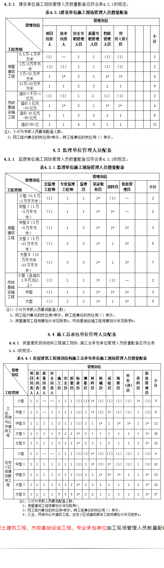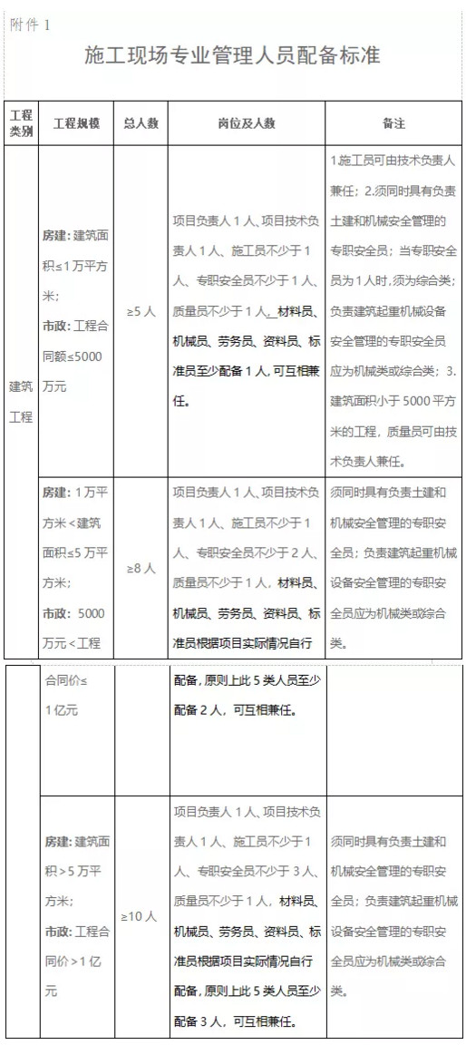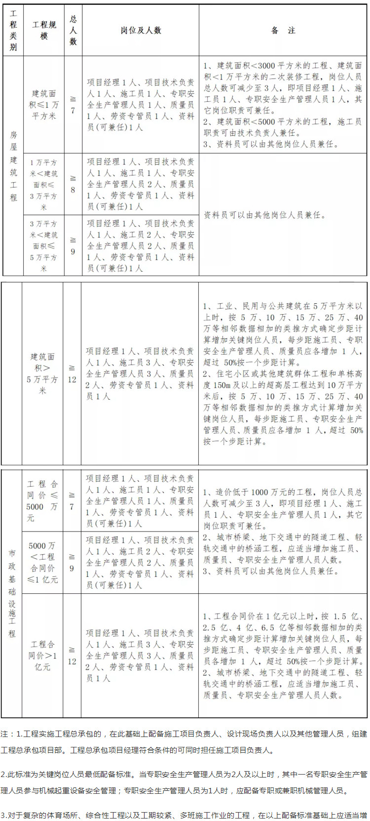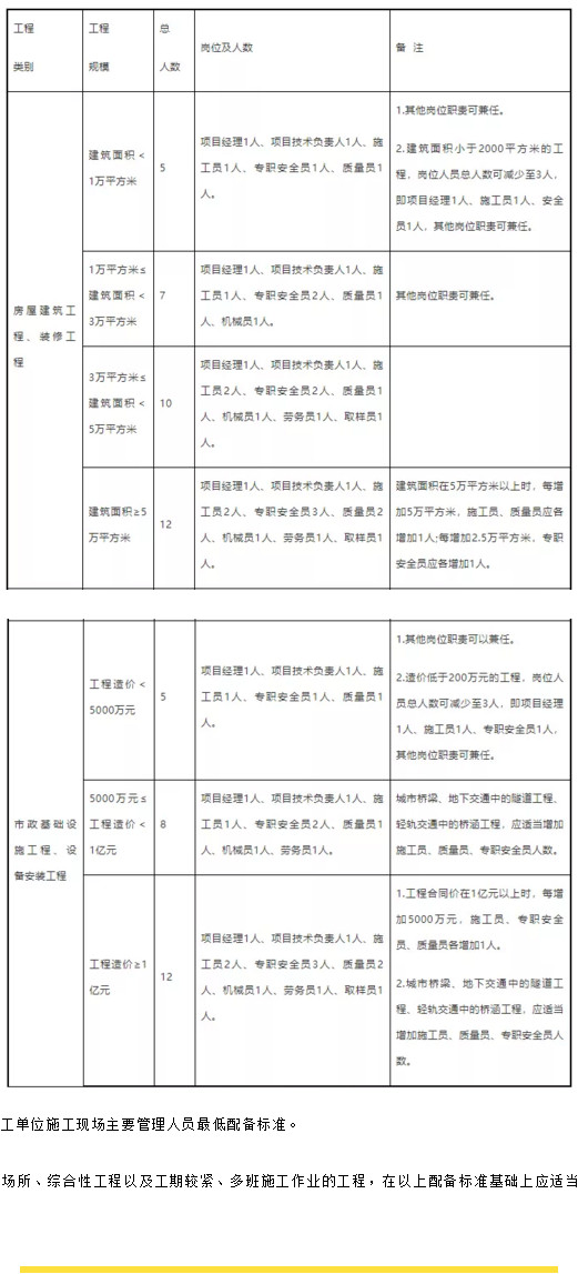 注:1.此標準為施工現場專業管理人員最低配備標準,施工企業應當根據工程項目施工實際工作需要配備人員。