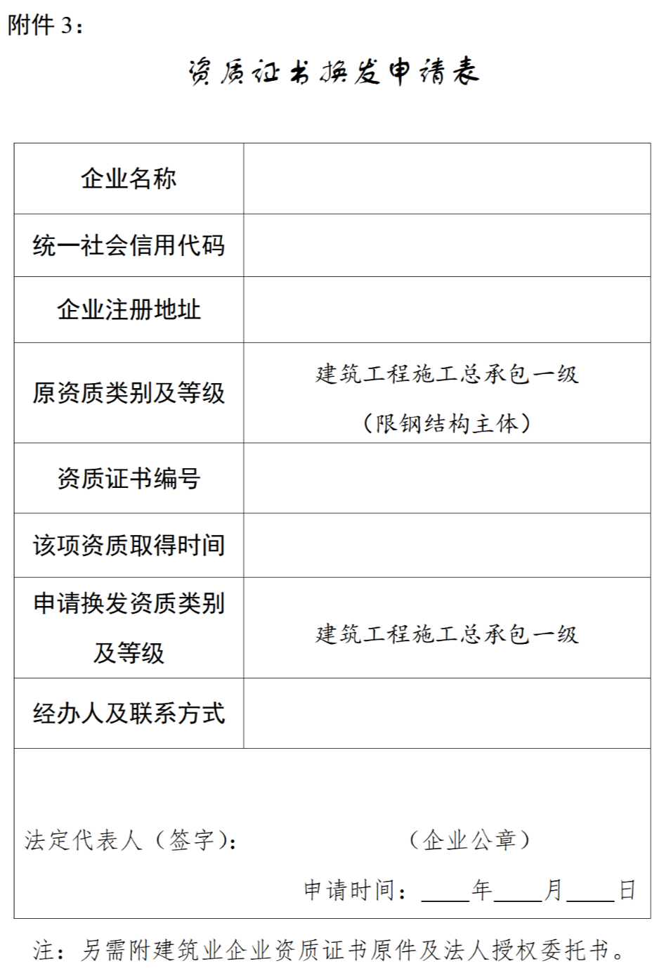 二、具有建筑工程施工總承包一級(jí)資質(zhì)(限鋼結(jié)構(gòu)主體工程)的建筑業(yè)企業(yè),可提交《資質(zhì)證書(shū)換發(fā)申請(qǐng)表》(見(jiàn)附件3),申請(qǐng)換發(fā)建筑工程施工總承包一級(jí)資質(zhì)證書(shū)。