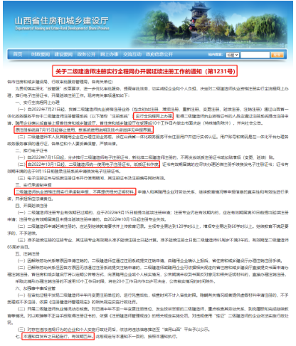 自2022年7月21日起,我省二級(jí)建造師執(zhí)業(yè)資格注冊(cè)業(yè)務(wù)(包含初始注冊(cè)、增項(xiàng)注冊(cè)、重新注冊(cè)、變更注冊(cè)、延續(xù)注冊(cè)、注銷注冊(cè))通過山西省一體化政務(wù)服務(wù)平臺(tái)中二級(jí)建造師注冊(cè)管理系統(tǒng)實(shí)行全流程網(wǎng)上辦理。