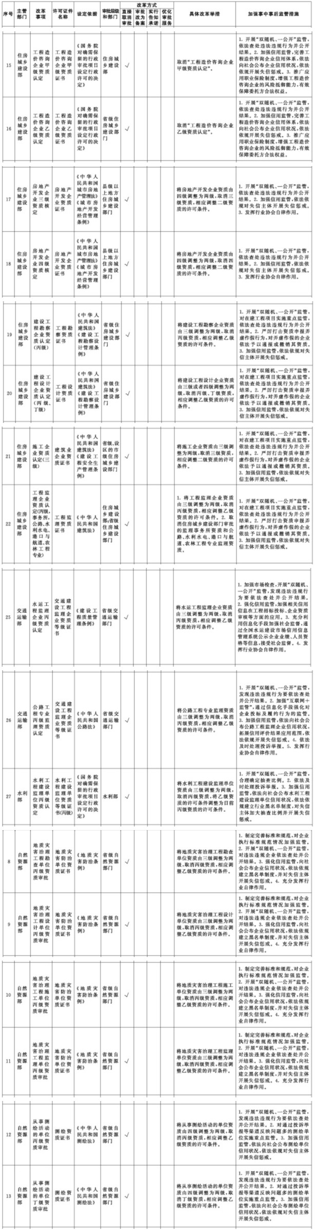在全國范圍內直接取消部分工程資質審批,其中包括工程造價、施工三級等資質: