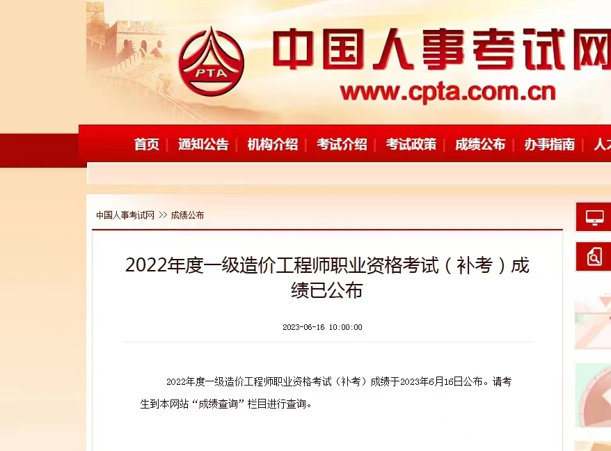 2022年度一級造價工程師職業資格考試(補考)成績于2023年6月16日公布。請考生到中國人事考試網站(http://www.cpta.com.cn/)點擊“成績查詢”欄目進行查詢。