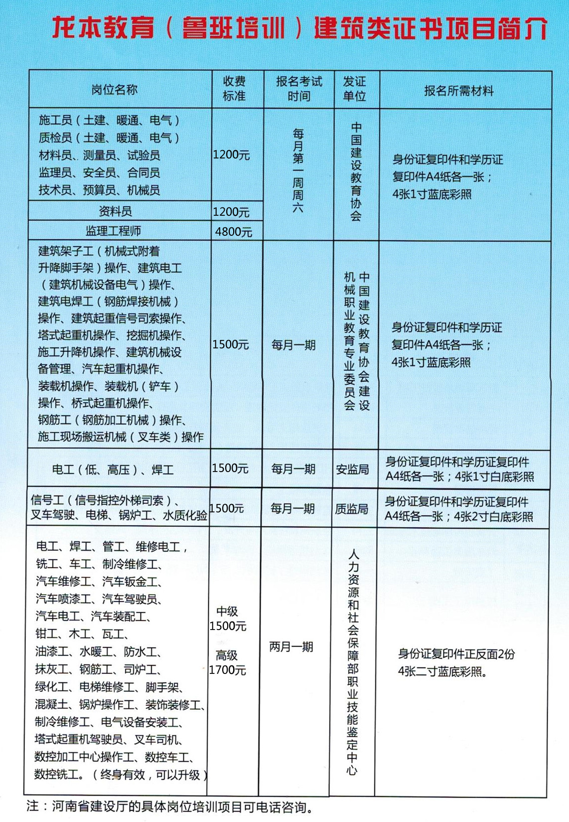 魯班培訓(xùn)河南分校主營(yíng):一級(jí)建造師培訓(xùn)、二級(jí)建造師培訓(xùn);BIM培訓(xùn);消防工程師培訓(xùn);造價(jià)工程師;監(jiān)理工程師;安全工程師等建筑人才及企業(yè)人才培訓(xùn);建筑學(xué)歷(鄭州大學(xué)、電大等);證書(shū)代注冊(cè);技工證;八大員;中級(jí)職稱代評(píng)等。